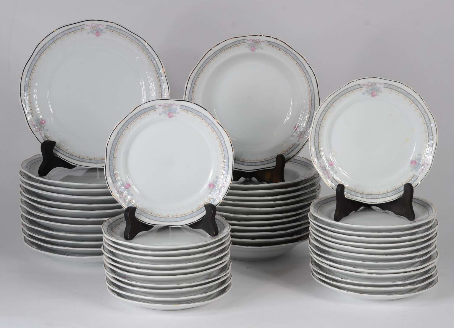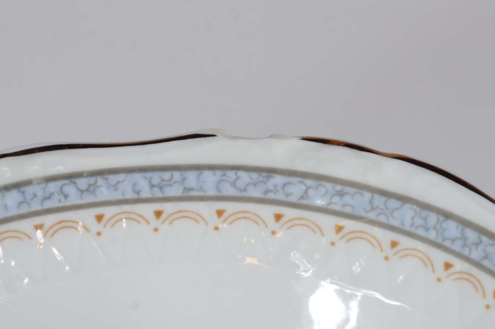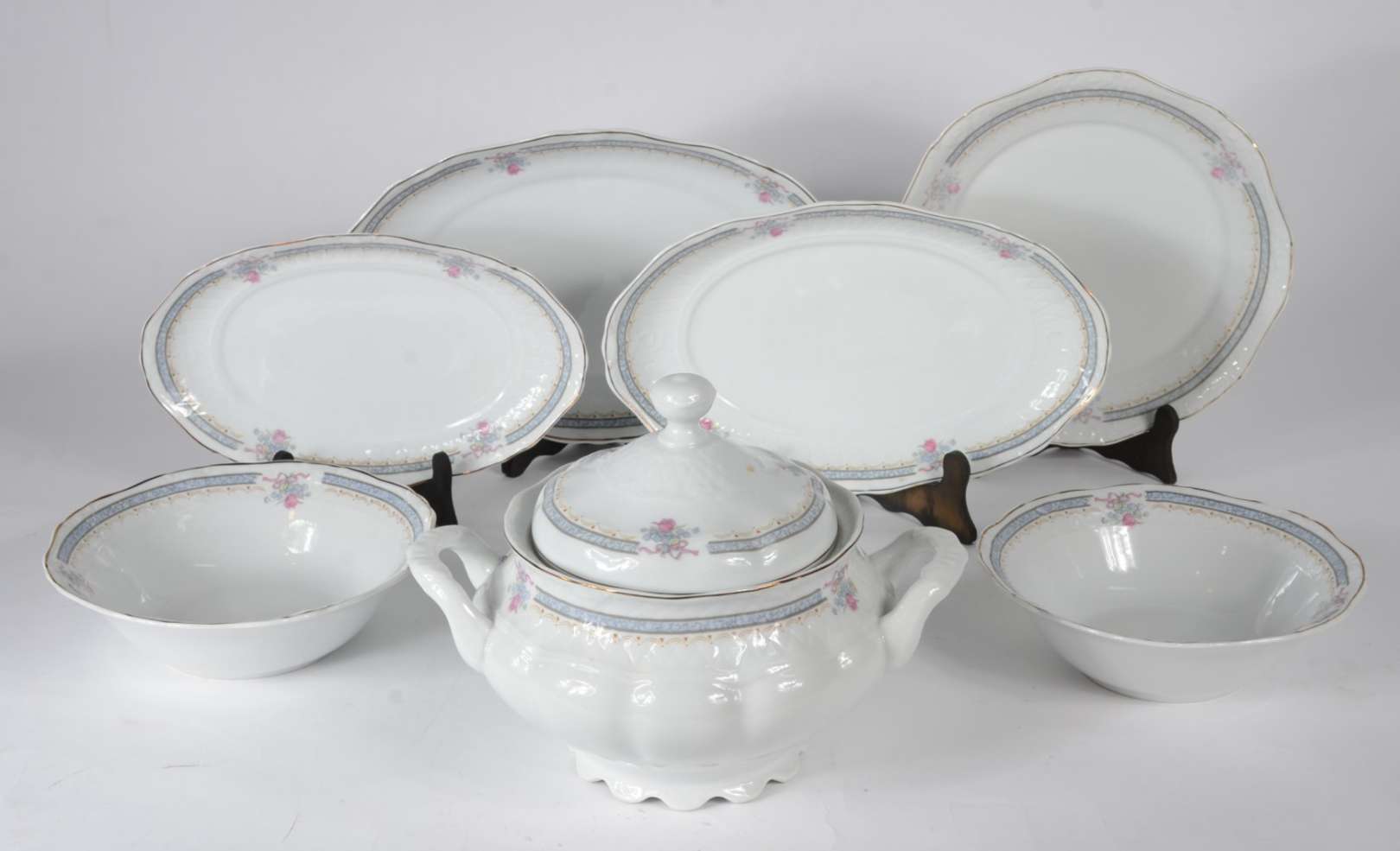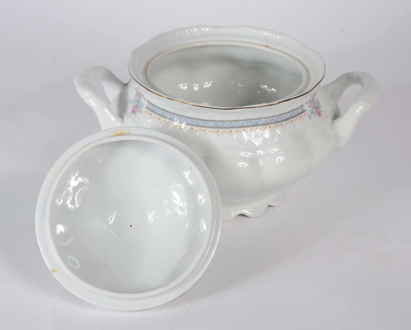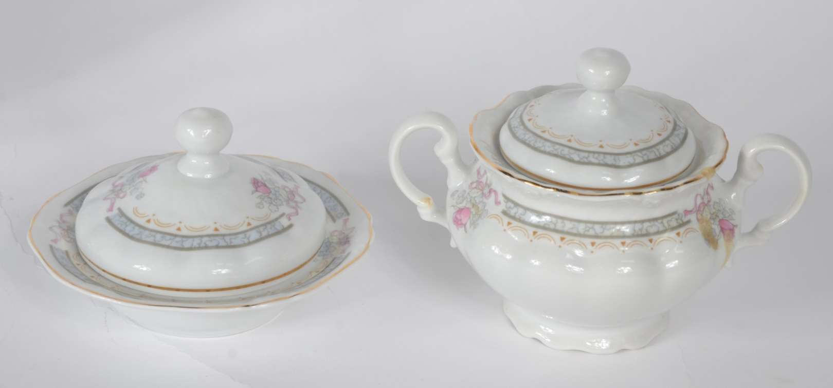 Tres peças de porcelana alemã, sendo: medalhão com cena romântica em policromia e 2 pratos brancos com bordas vazadas