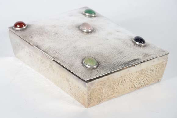 Caixa de prata de lei contrastada, aplicações de pedras coloridas, parte interna de madeira. Pequenos amassados. Peso...