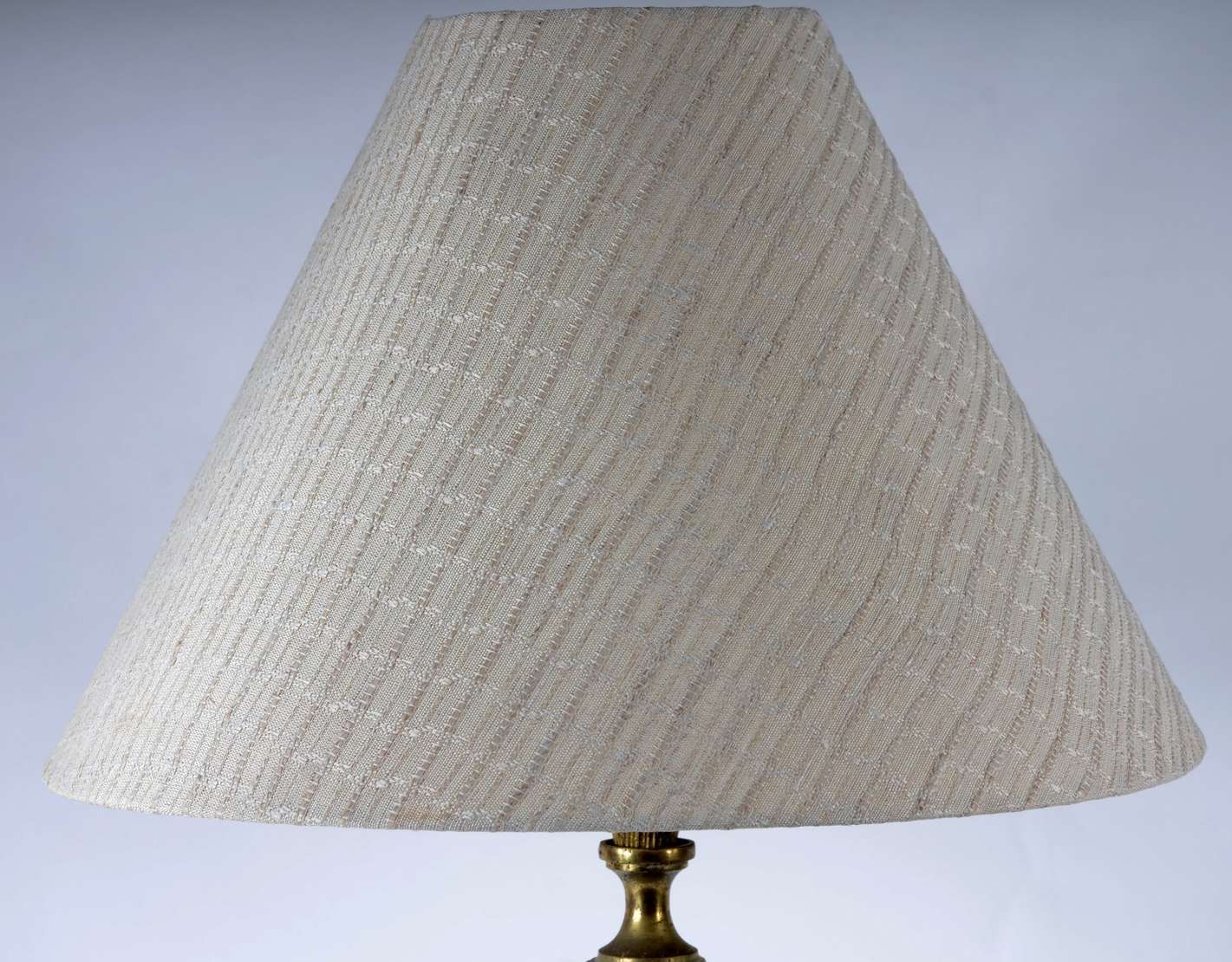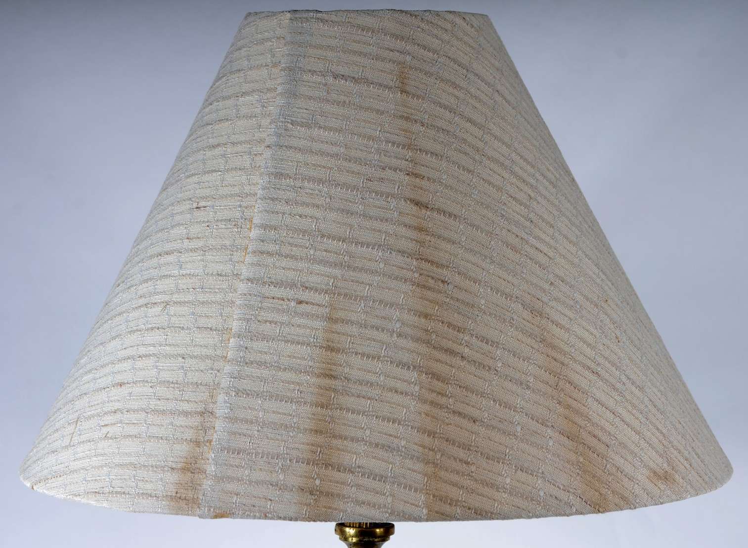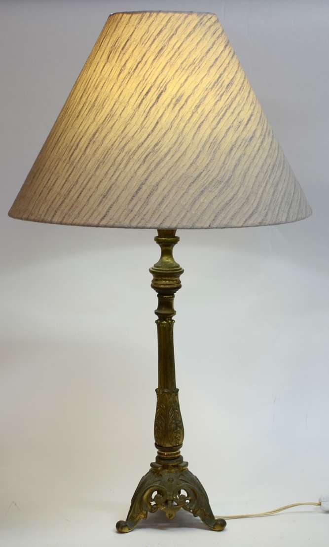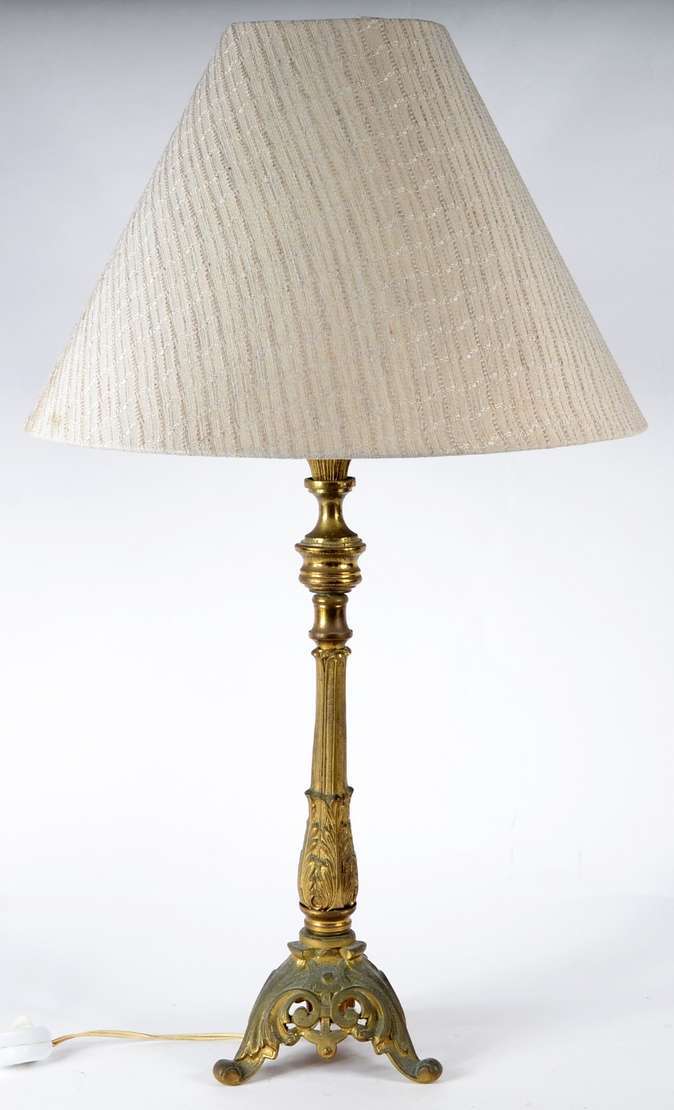 Abatjour de pé de metal dourado com mesa de mármore acoplada, cúpula na cor bege (metal oxidado).