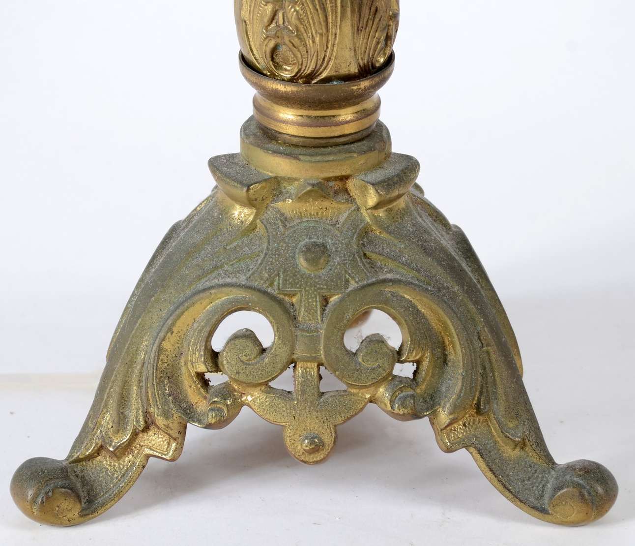 Par de abatjoures de metal com figuras de pucci (faltando uma figura - desgastes). Cúpulas no estado, precisando trocar.