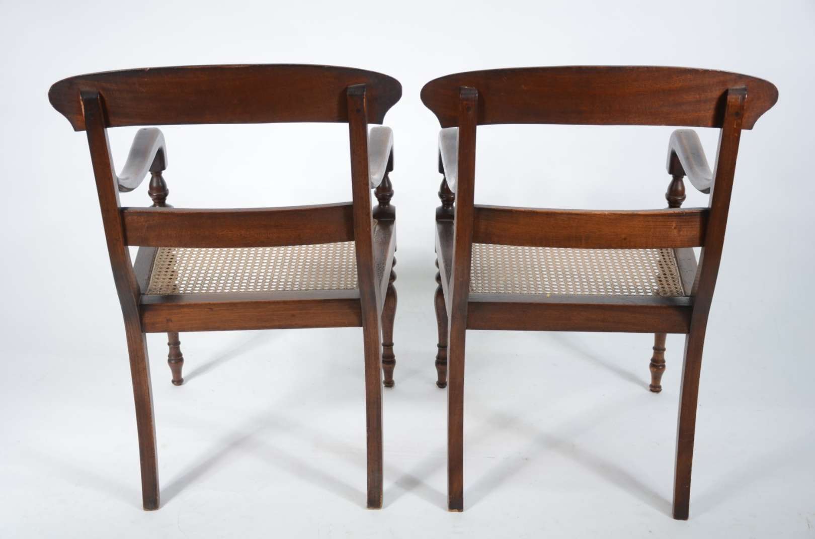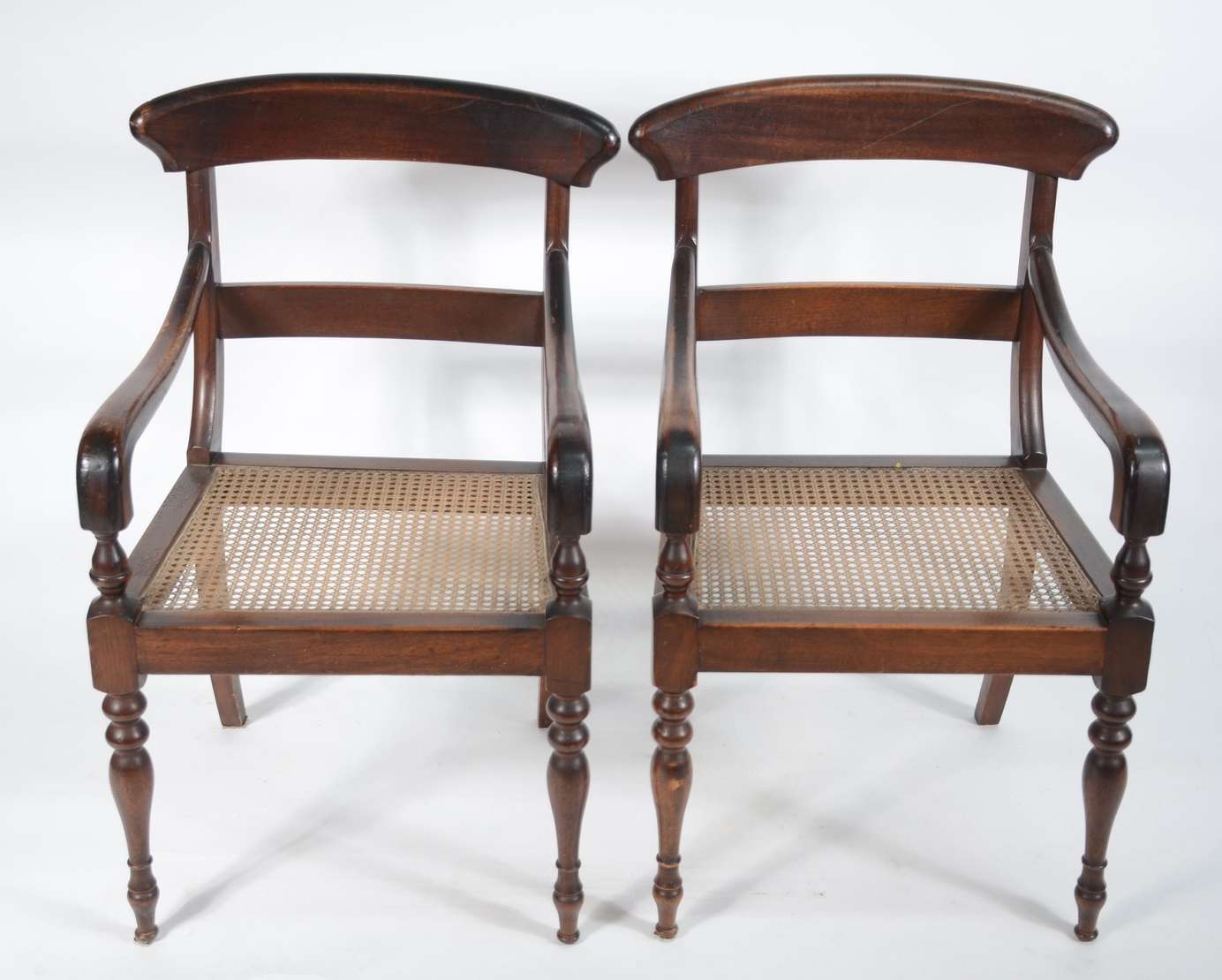 Par de cadeiras com braços de madeira nobre, assentos e encostos estofados e forrados na cor bege.
