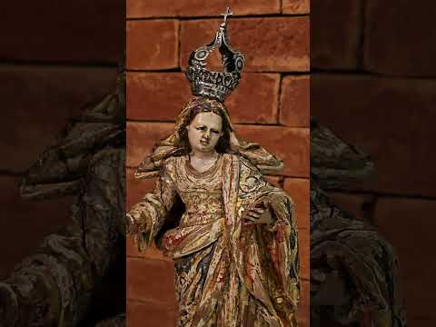 Duas imagens de presépio em madeira policromada representando José e Maria. O caimento de suas vestimentas serve de b...