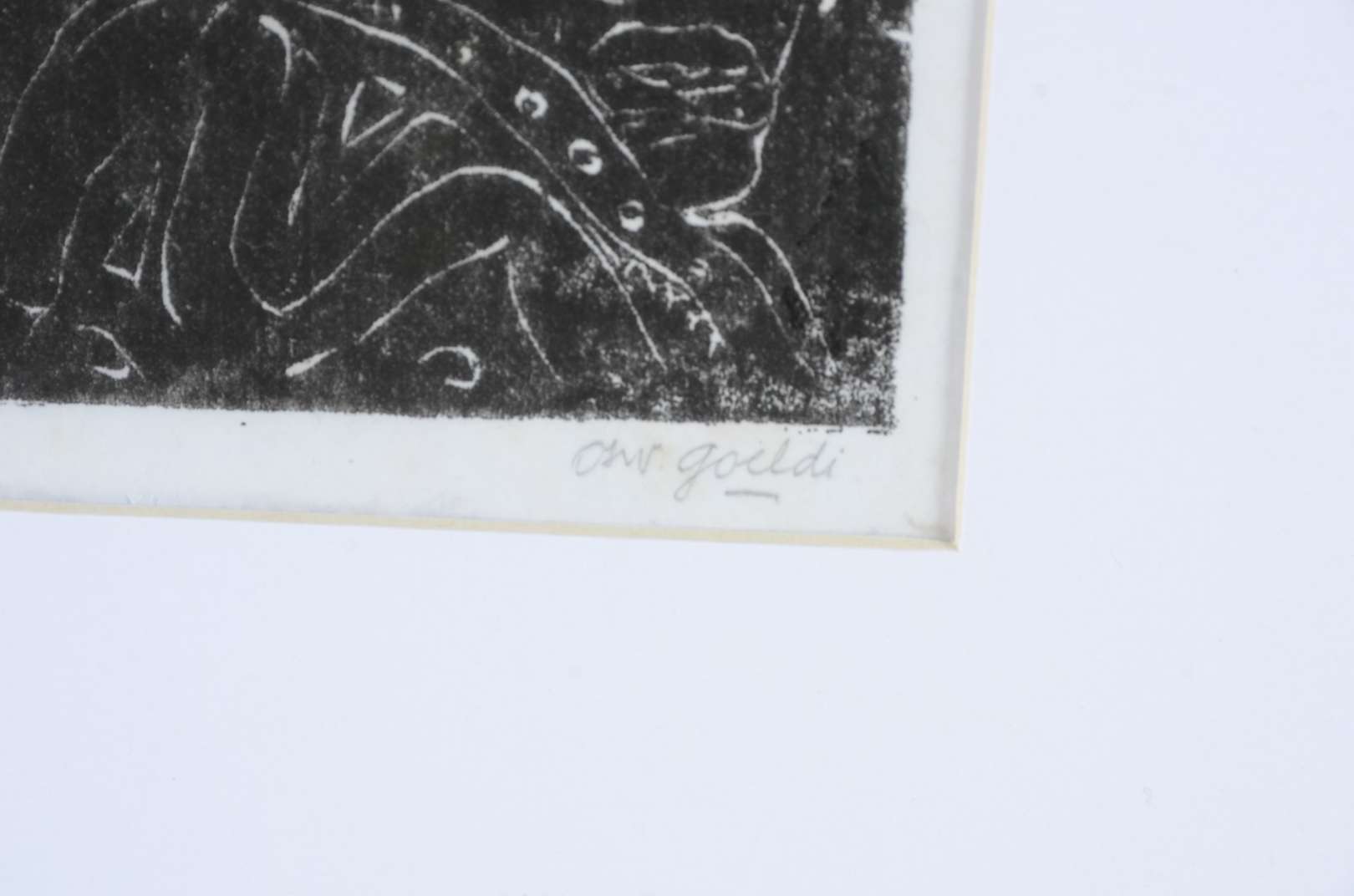 Desenho a bico de pena. Dedicatória ao amigo gravador Floriano Bicudo: " A Floriano Bicudo com o abraço de Goeldi". P...