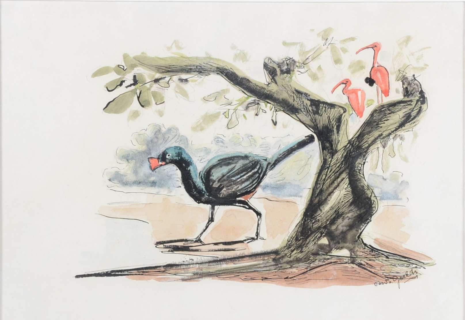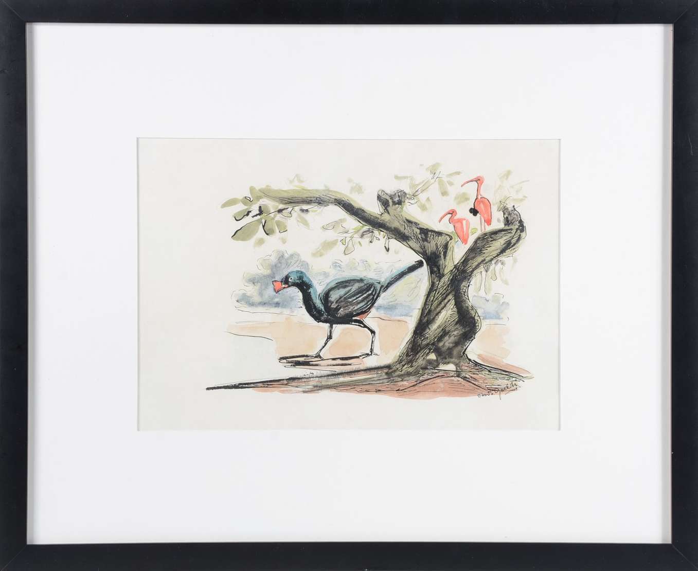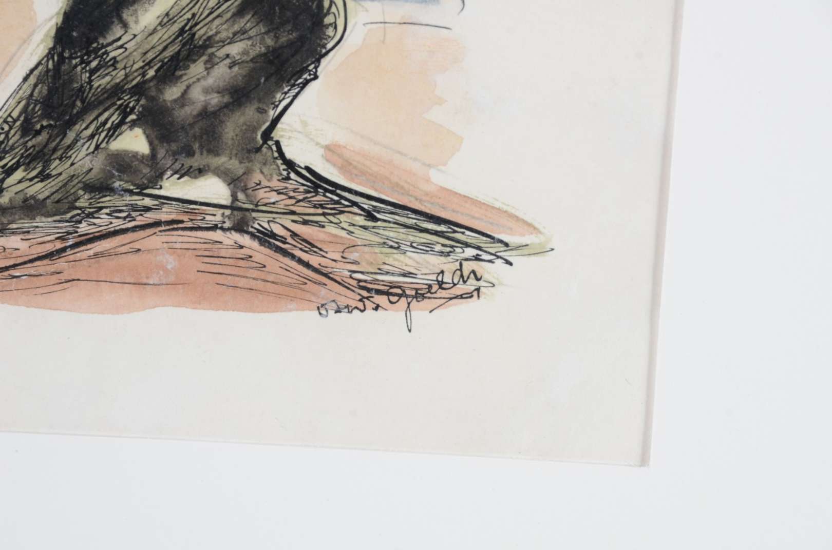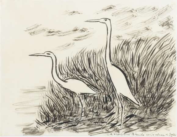 Desenho a bico de pena. Dedicatória ao amigo gravador Floriano Bicudo: " A Floriano Bicudo com o abraço de Goeldi". P...