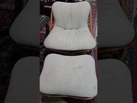 Par de poltronas estofadas em tecido na cor bege, pés palito. Tecido com manchas.