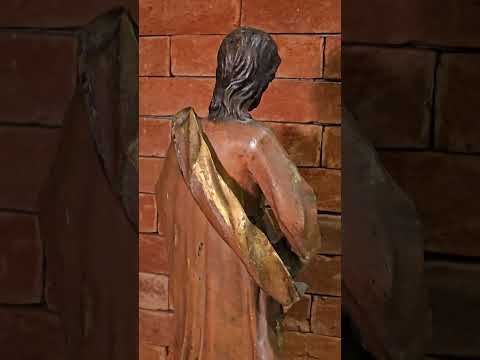 Antiga figura de Cristo esculpida em marfim, moldura de madeira entalhada e pequenos espelhos. Desgastes do tempo.