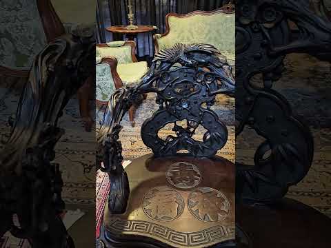 Rara poltrona chinesa em madeira escurecida, fartamente esculpida e ornada por volutas, vazados e gregas. Encosto ova...