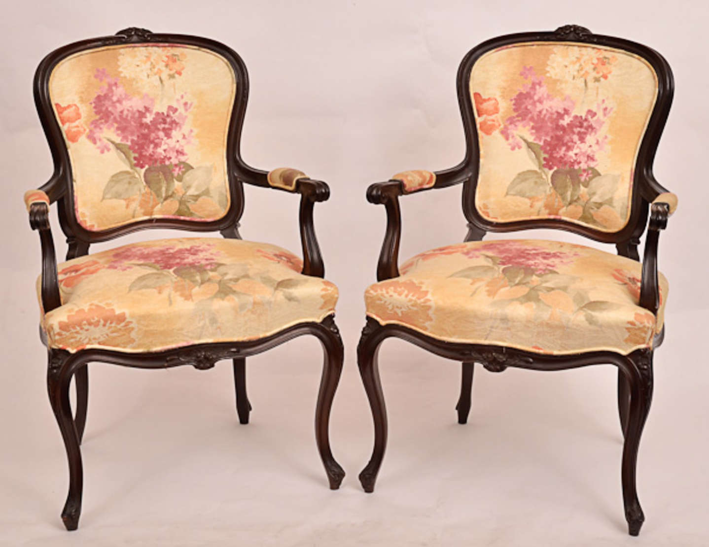 Par de cadeiras estilo Chipendale assentos e encostos estofados com tecido floral.