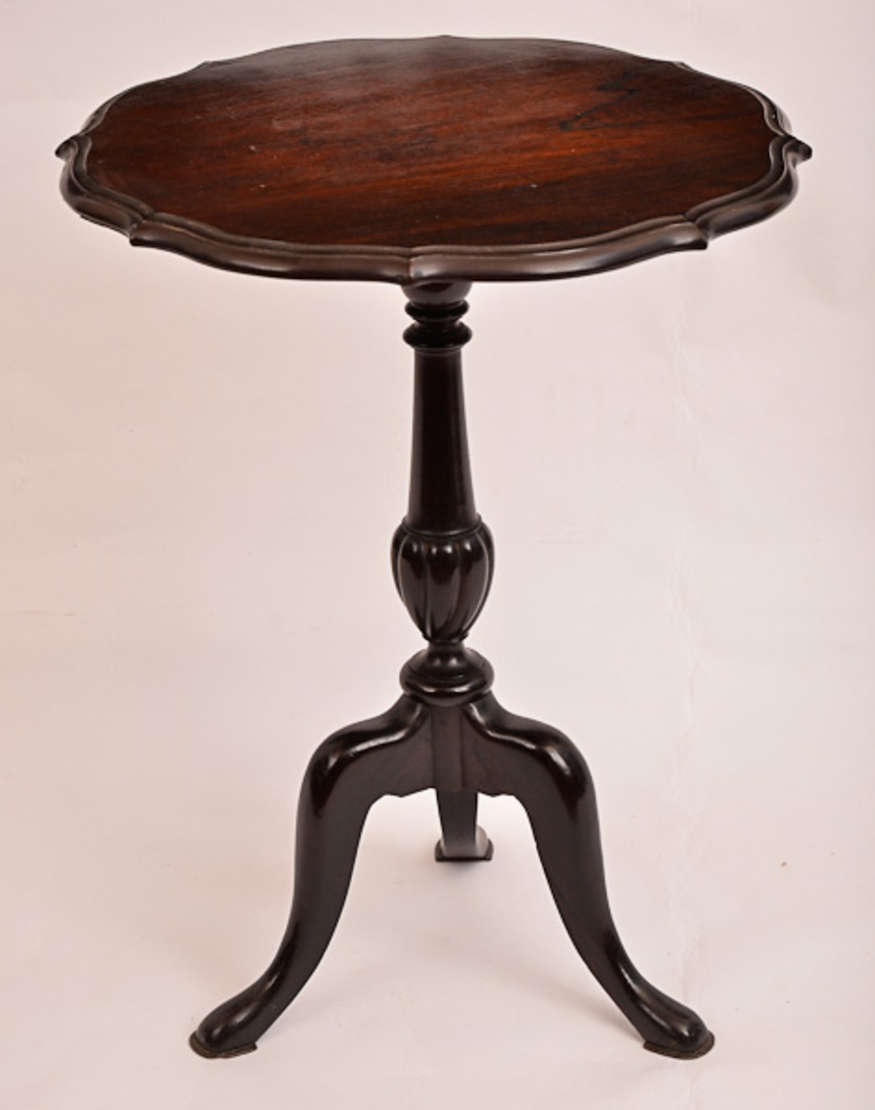 Gueridon de madeira nobre, borda recortada, base feitio tripé, med.diam. 52 alt. 67 cm.