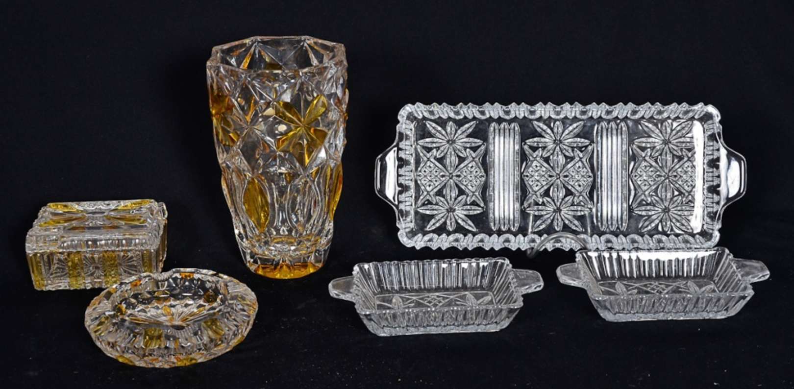 Duas peças de cristal sendo um prato para bolo e uma bomboniere.