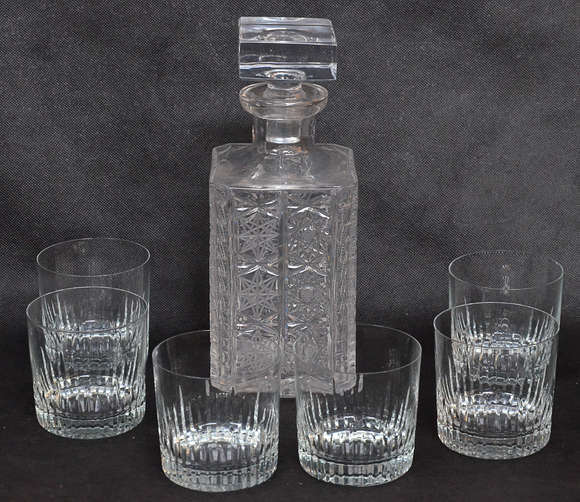 Sete peças de cristal lapidado, sendo uma garrafa e 6 copos para whisky.