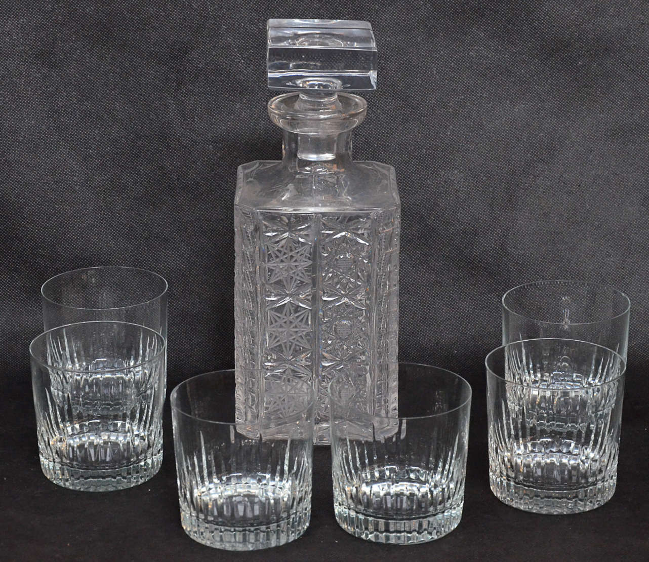 Licoreira com 6 copinhos de crital tcheco roxo e dourado. Alt.25 cm.