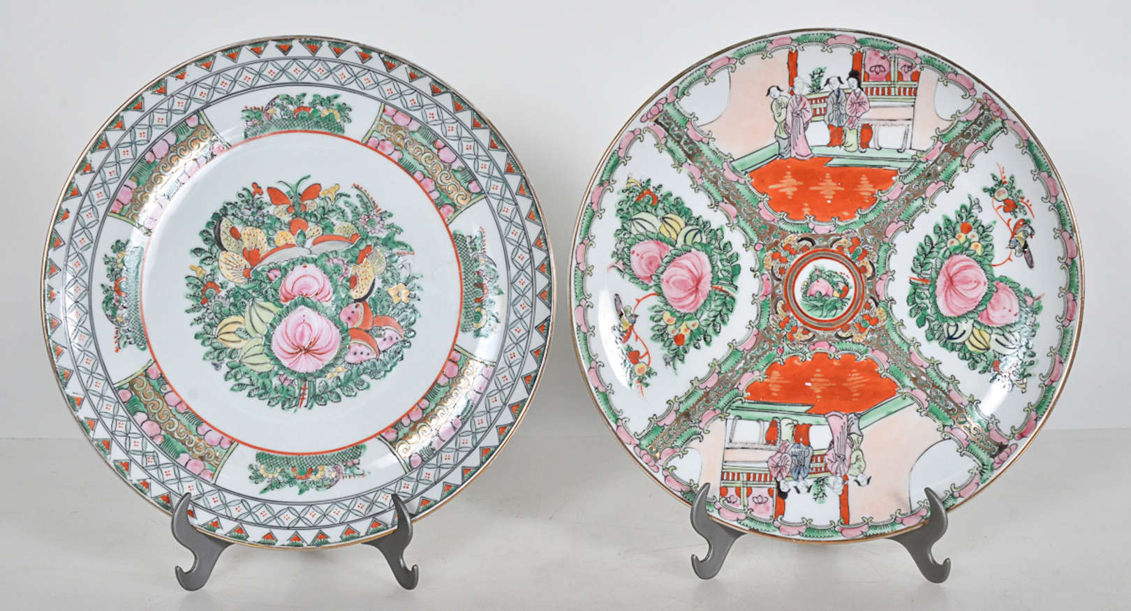 Prato de porcelana oriental com figuras em policromia e vazados, diam. 28 cm.