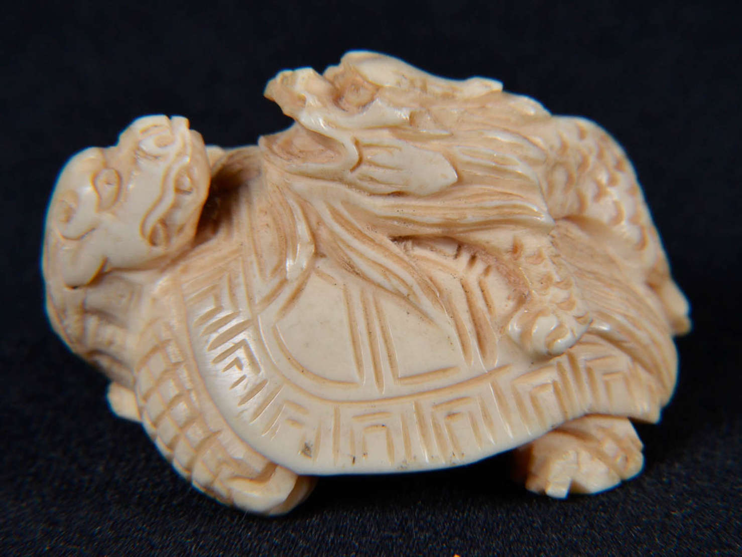 Netsuke de marfim repres figura com rede. Med. 5cm.