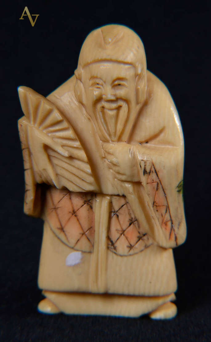 Netsuke de marfim repres figura com rede. Med. 5cm.