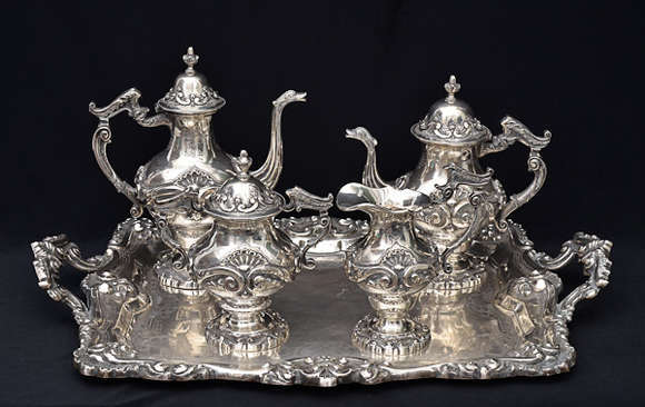 Servico de chá e café de prata portuguesa contraste AGUIA, estilo D. JOAO V, com volutas, flores e bico de pato, com...