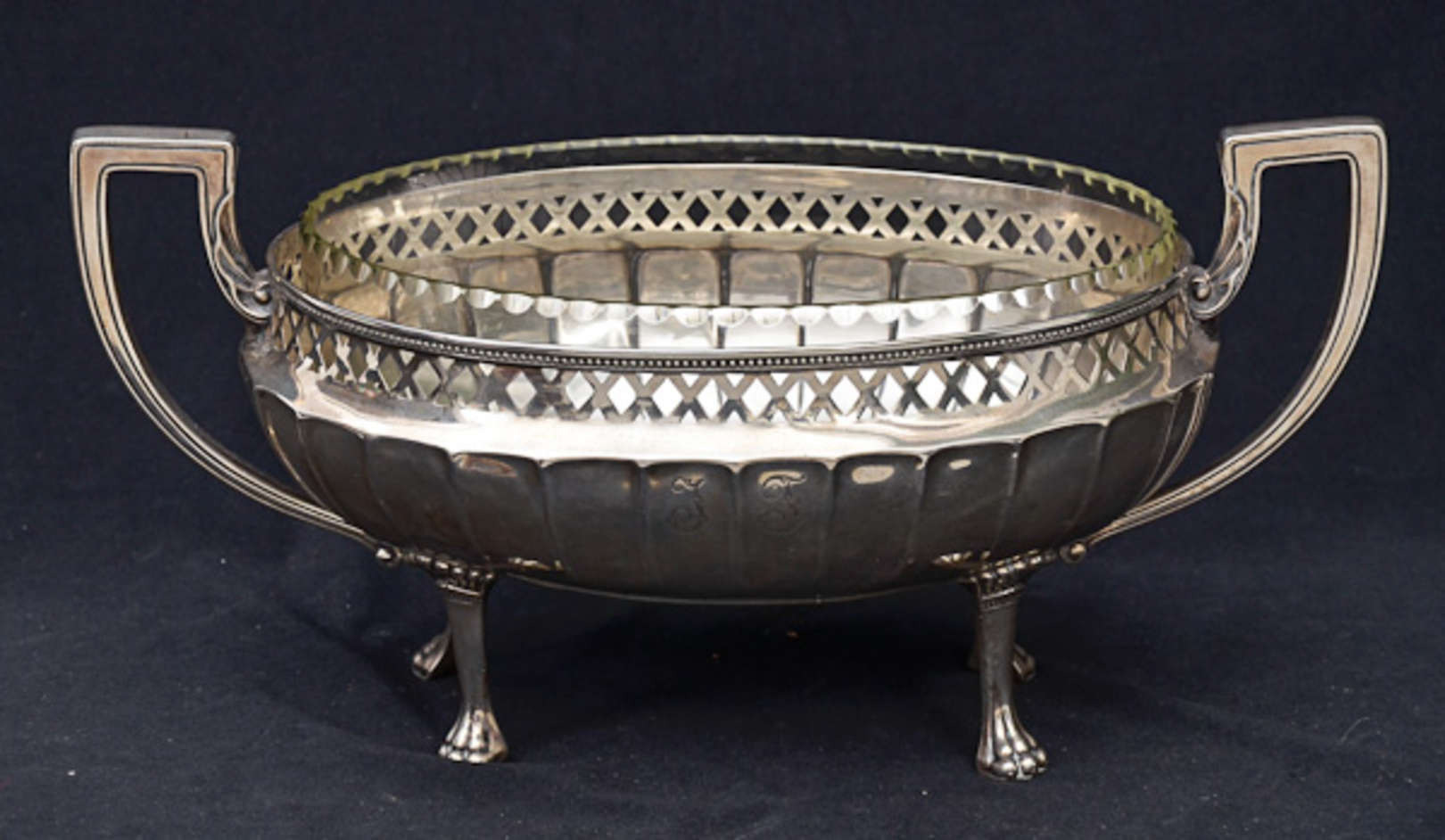 Tabuleiro oval de prata brasileira cinzelada e guilhoxada , galeria vazada em parras e uva, fundo c/ volutas e folha...