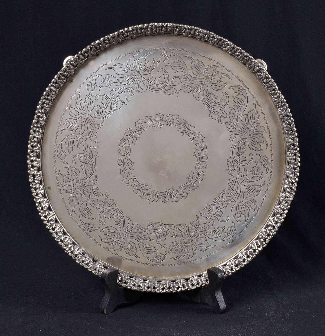 Salva de prata contraste 800 mls, fundo cinzelado, pes e galeria vazado, diam. 35cm.