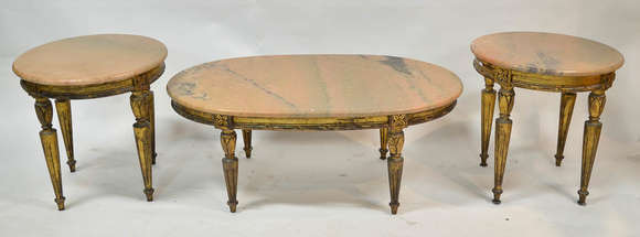Conjunto com 3 mesas estilo frances, de madeira dourada com 4 pernas cilindricas frisadas e tampos de mármore rosa, s...