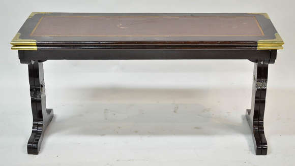Mesa de centro de madeira nobre, estilo ingles, dobravel, cantos arrematados com metal dourado, tampos de couro. Med....