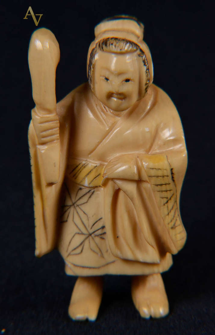 Netsuke de marfim repres figura com rede. Med. 5cm.