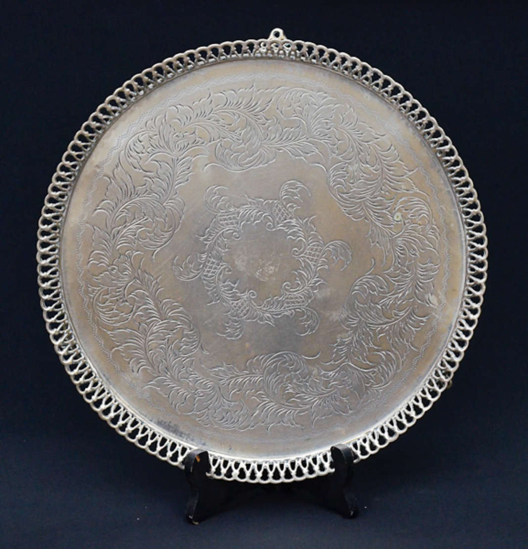 Salva de prata constraste 800mls,fundo cinzelado, galeria vazado, diam.29cm.
