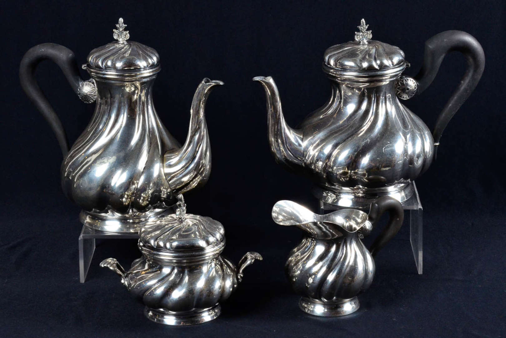Servico de chá e café de prata portuguesa contraste AGUIA, estilo D. JOAO V, com volutas, flores e bico de pato, com...