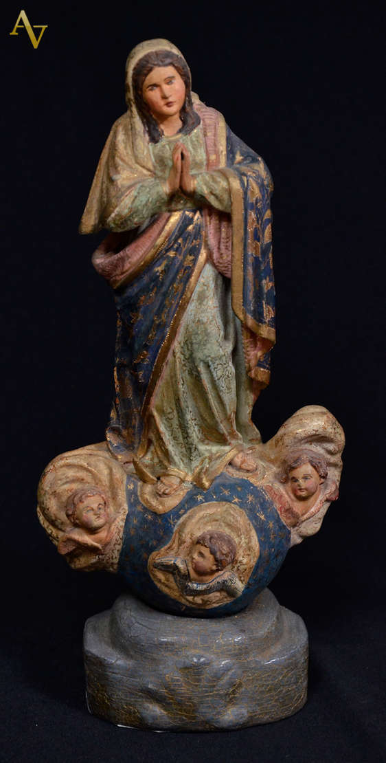 NOSSA SENHORA -Antiga imagem de madeira policromada e dourada, com coroa. Alt. 37 cm.