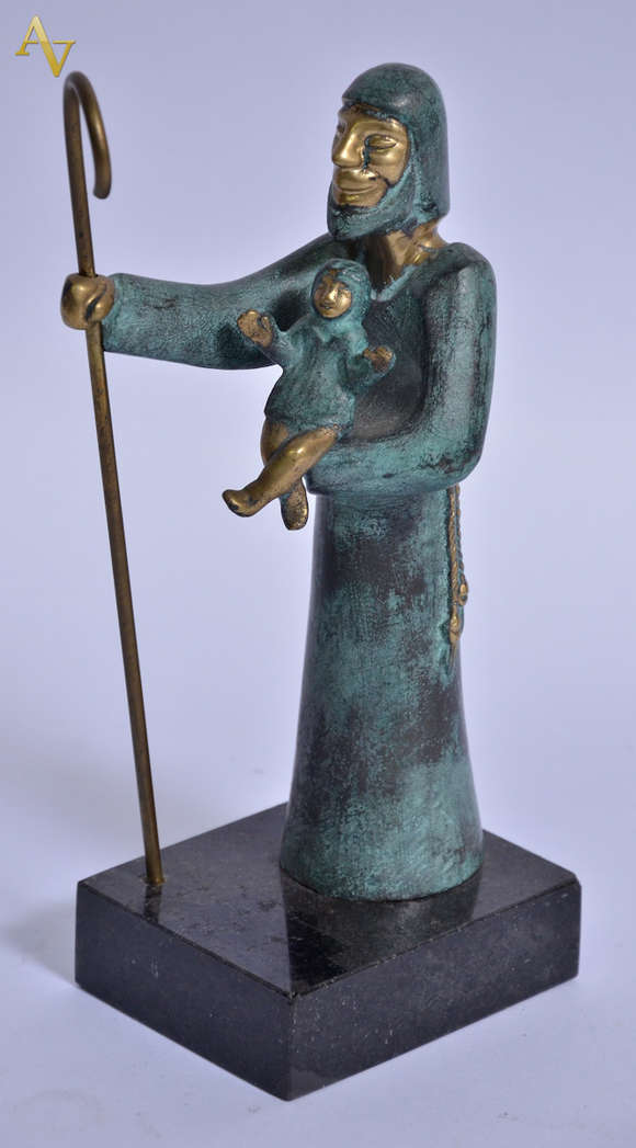 Escultura em bronze patinado, nas cores verde e dourado, representando Sao Jose com menino, apoiado em base de granit...