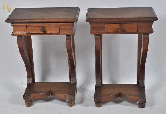 Par de mesinhas laterais de madeira nobre, pernas frontais arqueadas, uma gaveta cada. Alt. 63 cm - meds. 43 x 28.