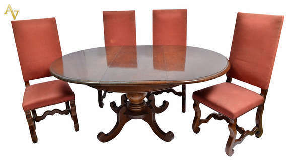 Mesa de jantar de madeira nobre, diam.1,20 m. com tábua extensora de 49 x 1,20 m., base feitio balaústre central term...