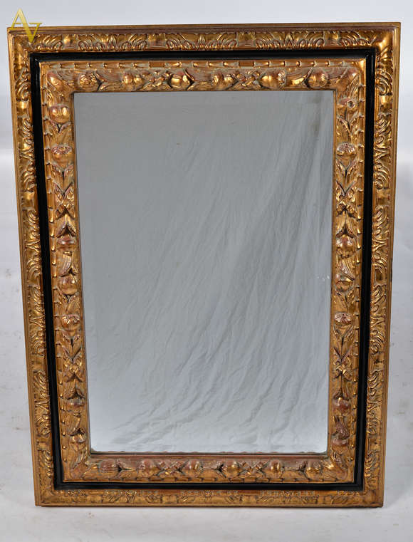 Pequeno espelho com moldura dourada entalhada com flores. Med.45 x 77 cm.