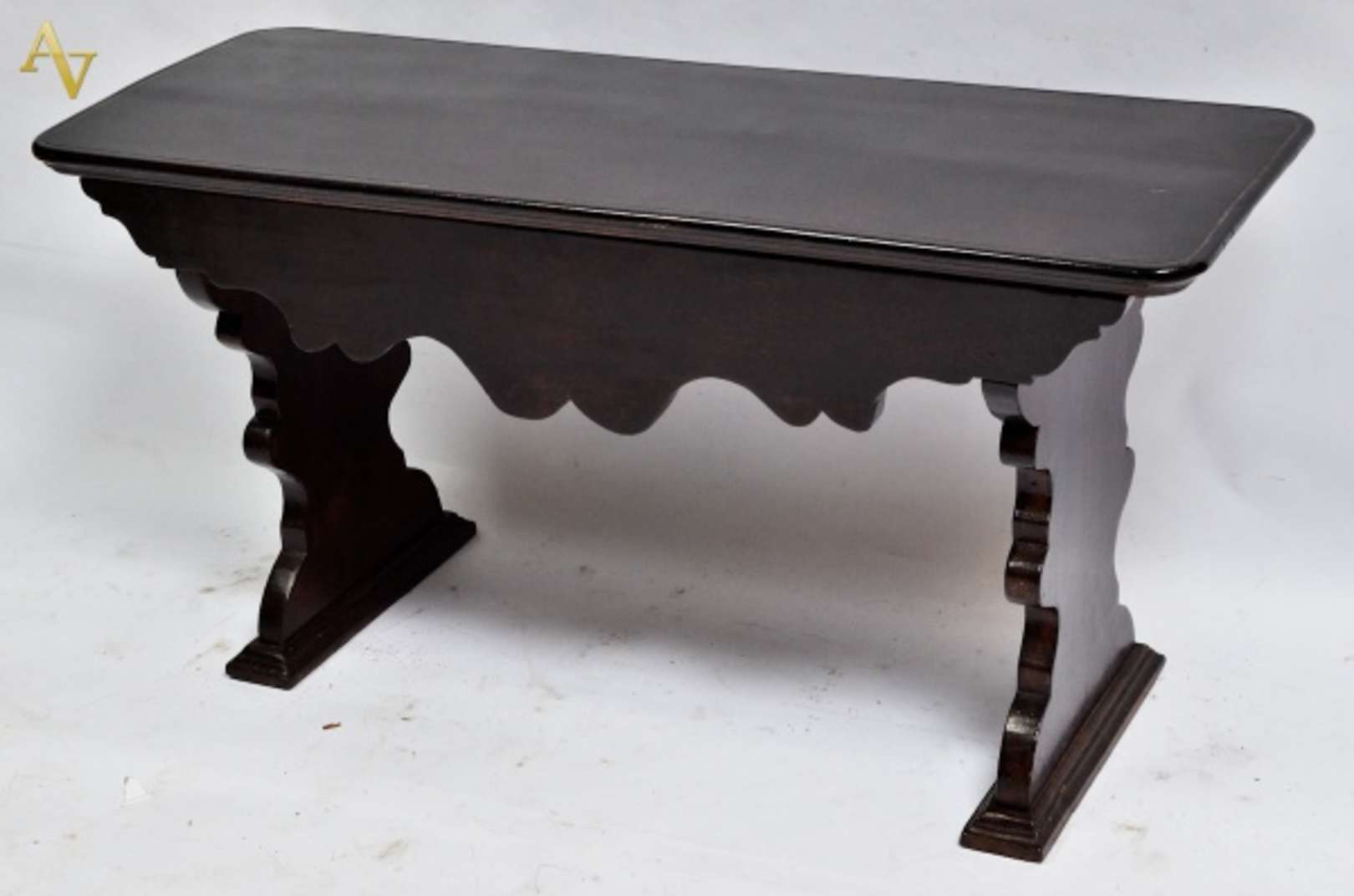 Console de jacarandá c/ tampo dobrável, apoio em coluna central gomada terminando em 4 pernas recurvas. Med. fechada ...