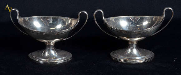 Par de pequenas navetes de prata contrastada, alt. 8 cm.