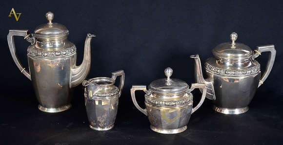 Baixela para chá e cafe de prata 800 mls contrastada, comp.de 2 bules, açucareiro e leiteira, isoladores de marfim. ...