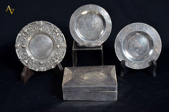 Quatro peças de prata, sendoTrês salvas mexicanas e portuguesas( diam. 10, 12, 13 cm) e caixa mexicana ( med. 14 x 4...