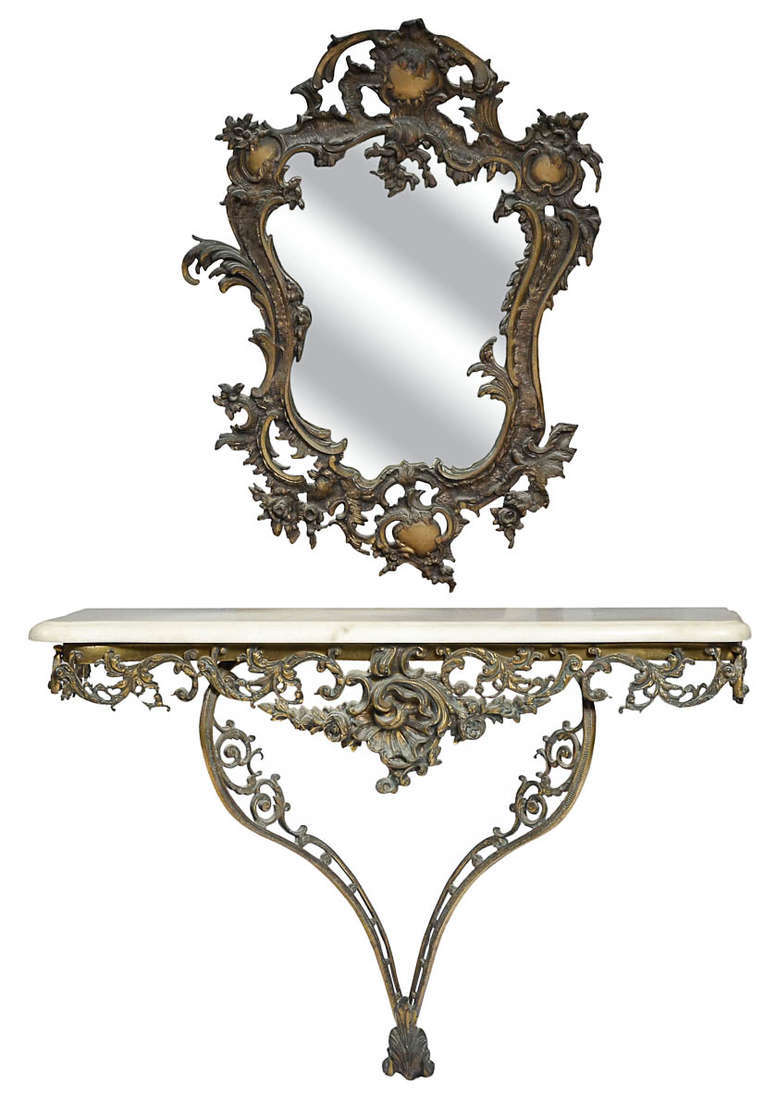 Pequeno console de bronze com tampo de mármore (med.79 x 26 alt.56 cm) e espelho (med. 70 x 50 cm)