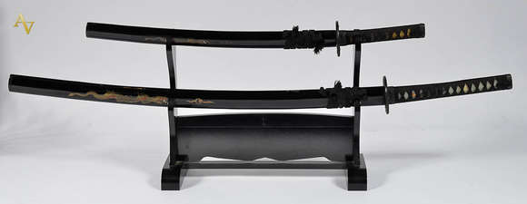 Duas espadas de samurai (comp. 69 cm e 1 m) c/ base de madeira ( alt. 32 cm).
