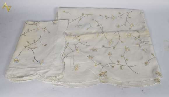 LÍGIA MATOS- Conjunto com dois lençóis e 2 fronhas bordados c/ ramos na cor prata e ouro.