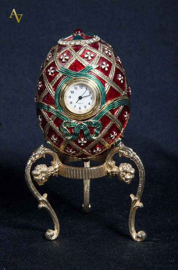 Ovo no estilo Fabergé c/ relógio e base de metal. Alt. total 12 cm.