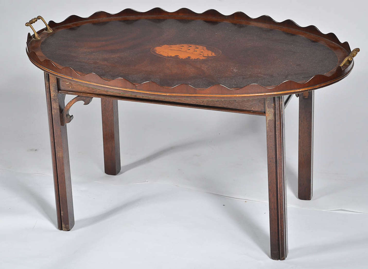 Mesa da centro feitio oval de madeira nobre trabalhada com marqueterie. Larg. 60 cm, comp. 1.18 m, alt. 44 cm.