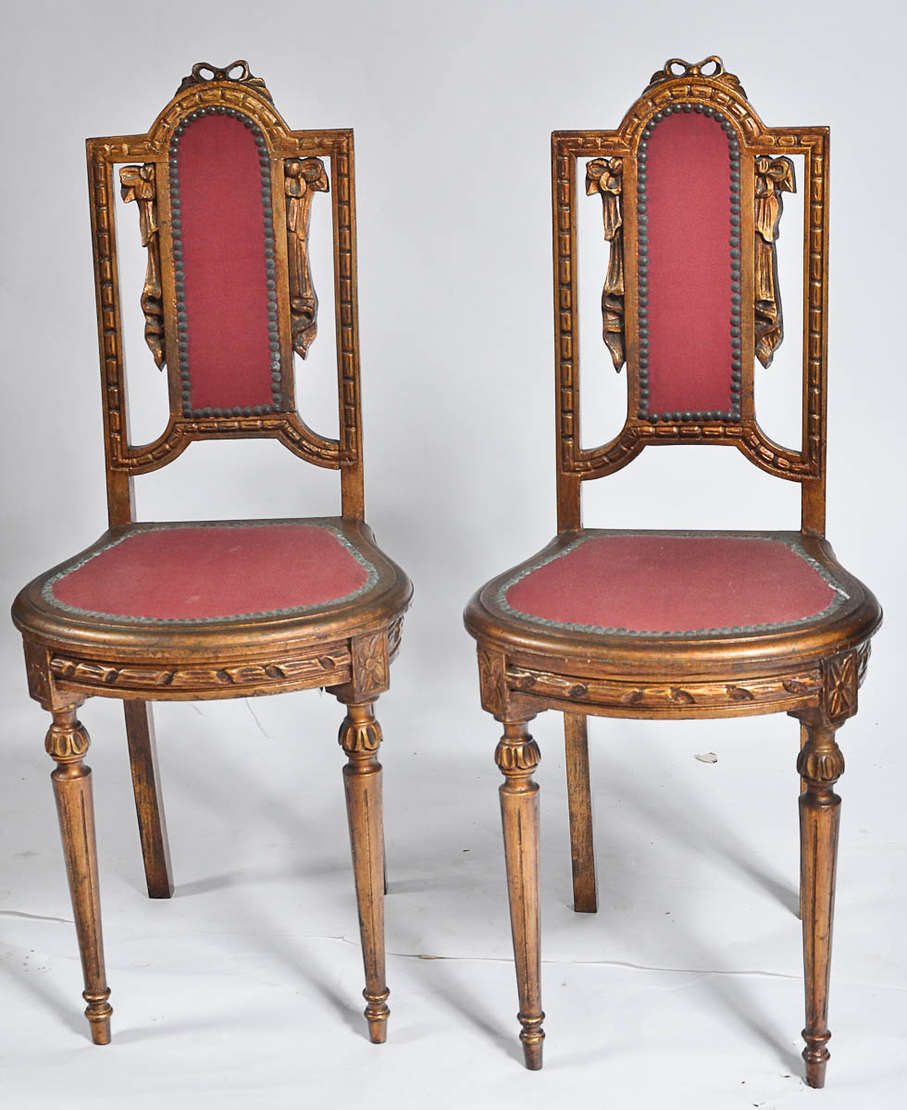 Par de pequenas cadeiras de madeira nobre, assentos e encostos estofados.