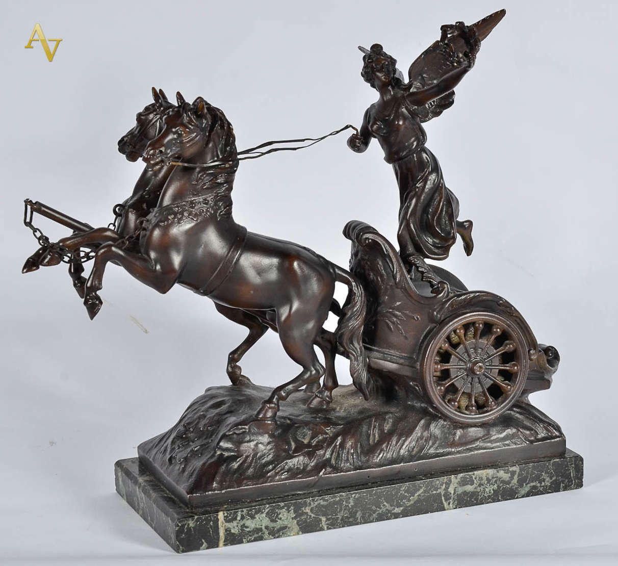 Cachepot frances de bronze com acantos e figuras em relevo. Base de mármore preto belga. Alt. 46 cm.